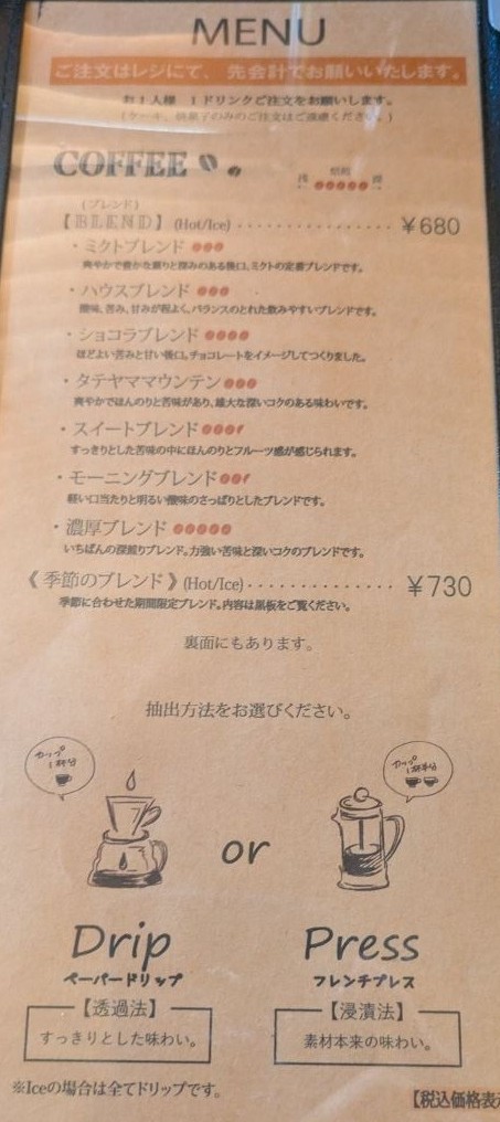 平日の午後に行ってきました!半分ぐらいの席が埋まってましたが、ゆったっりとした静かな時間を過ごすことができました。休日は駐車場がいっぱいになっており、いつも諦めてたので、個人的には平日がおすすめです!ミクトブレンドとクッキーを注文しました。